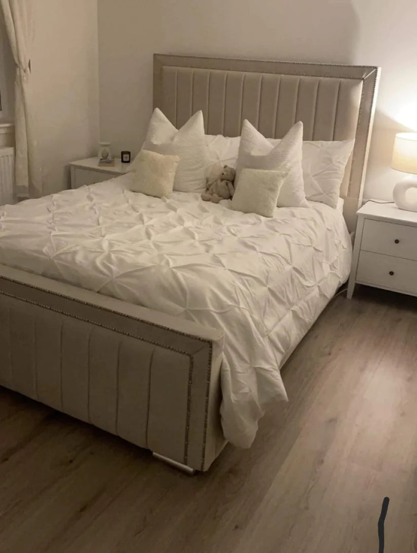 Regular price £249.00 GBPSale price £249.00 GBP Regular priceUnit price perSale Sold outBeautifully handcrafted Rome upholstered bed is available in all sizes and various other colors and fabrics. Fits a standard UK size mattress. Your choice of diamontes...
